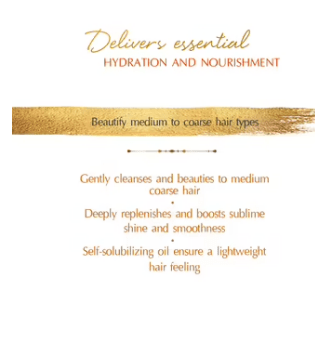 This divine shampoo gently cleanses and beautifies medium to coarse hair. The luxurious formula deeply replenishes the hair – adding a smooth shine, whilst self-solubilising oil ensures a lightweight hair feeling.