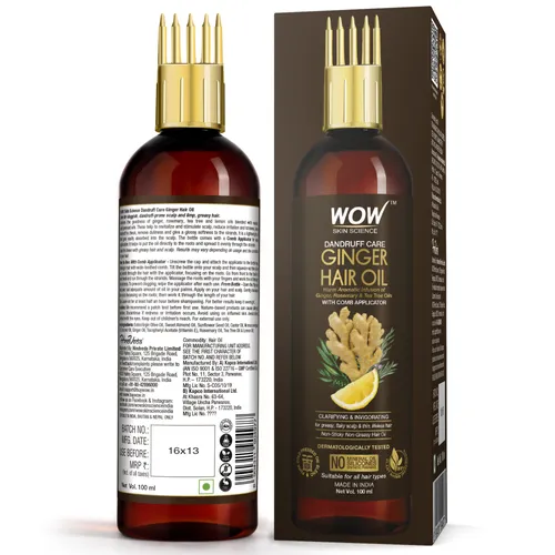 Care for your sluggish, dandruff-prone scalp and limp, greasy hair with WOW Skin Science Ginger Hair Oil for Dandruff Care Hair Oil with Comb Applicator. This all-natural hair oil delivers the nutrients directly to your roots and protect the weak strands with its conditioning effect. It is infused with the goodness of ginger, rosemary, tea tree and lemon oils. These potent actives are blended with hair-nourishing, cold-pressed oils rich in omega fatty acids, vitamin E, minerals and antioxidants. These help to condition dry scalp, nourish the roots. They help to revitalize and stimulate scalp, reduce irritation and itchiness, keep dandruff in check, remove dullness and give a glossy softness to the strands. It is a lightweight oil that gets easily absorbed into the scalp. Ideal for those with greasy hair and scalp. Results may vary depending on usage and condition of your hair.