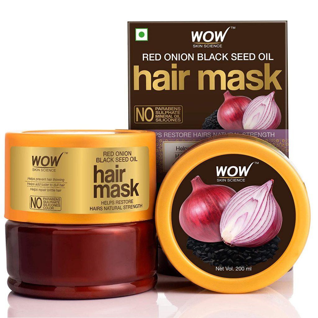 - This red onion extract, black seed oil, and Hydrolyzed Wheat Protein infused hair mask helps to form a barrier that protects and softens the strands.