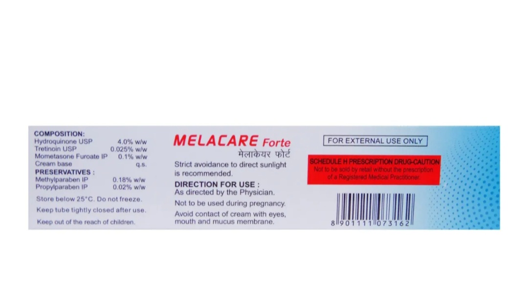 Melacare Forte Cream is used to treat melasma (dark brown patch on skin). It works by decreasing the amount of melanin (a skin pigment) that is responsible for the darkening of the skin.