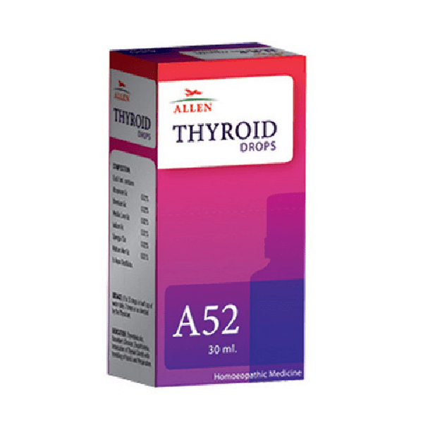 A52 Thyroid Drops is useful for all types of hyperthyroidism. Grave’s disease; Toxic adenomas; Sub acute thyroiditis; Pituitary gland malfunctions or cancerous growths in the thyroid gland. Composition of Allen A52 Thyroid Drops Atropinum 3x Bromium 3x Hekla Lava 3x Iodum 3x Spongia Tosta 3x Natrum Muriaticum 3x in aqua destillata