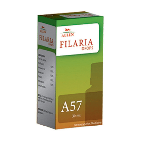 A57 Filaria Drops in indicated for filariasis or philariasis, a parasitic disease caused by an infection with roundworms of the Filarioidea type. These are spread by blood-feeding black flies and mosquitoes. Composition of Allen A57 Filaria Drops Acidum Hydroflouricum 3x Hamamelis Virginica Q Arsenicum Album 3x Cedron 3x